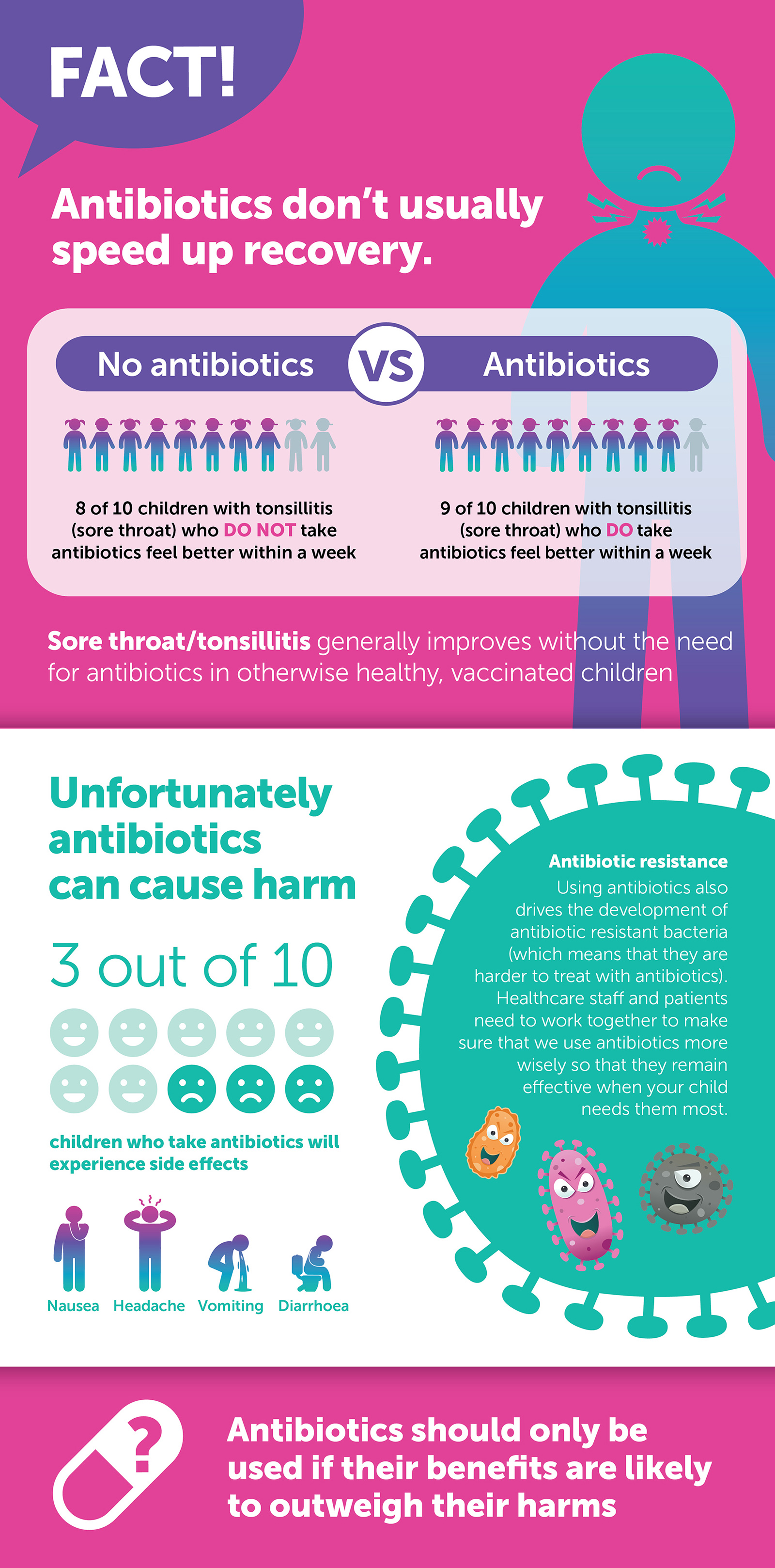 - Viral infections tend to get better on their own and do not need treatment with antibiotics. Antibiotics may actually cause side effects such as rash and diarrhoea and can increase the risk of them developing antibiotic resistance