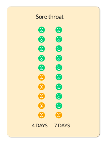 - The chart below shows how long sore throats take to get better in children. The faces represent 10 children who have seen their GP with a sore throat. Green faces are those children whose sore throat has got better within that time period